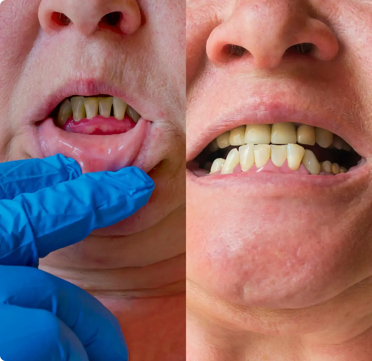 Die Ansammlung von Bakterien führt zudem häufig zu anhaltendem Mundgeruch sowie zu Zahnfleischerkrankungen, die von Gingivitis zu fortgeschrittener Parodontitis fortschreiten können – mit Folgen wie Zahnfleischrückgang, Knochenschwund und schließlich Zahnverlust.